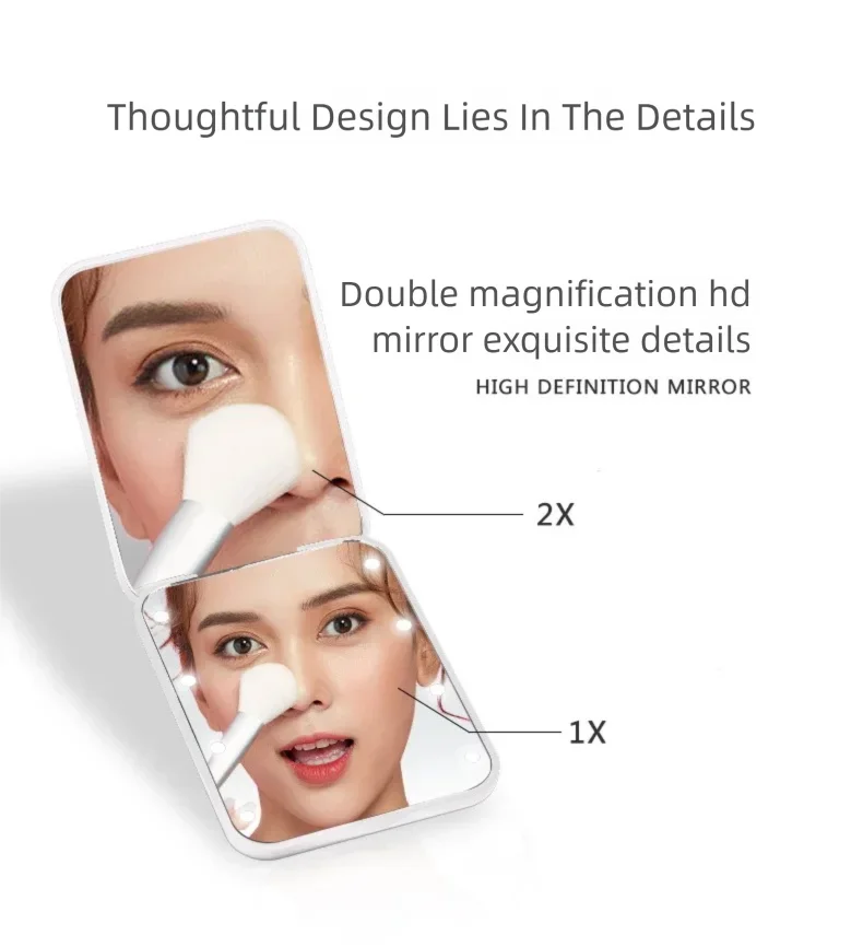 8 LED Lights & 2x Magnification: One side is a standard mirror, while the other offers 2x magnification with 8 LED beads for bright, even illumination—ideal for detailed makeup, skincare, or eyelash application.