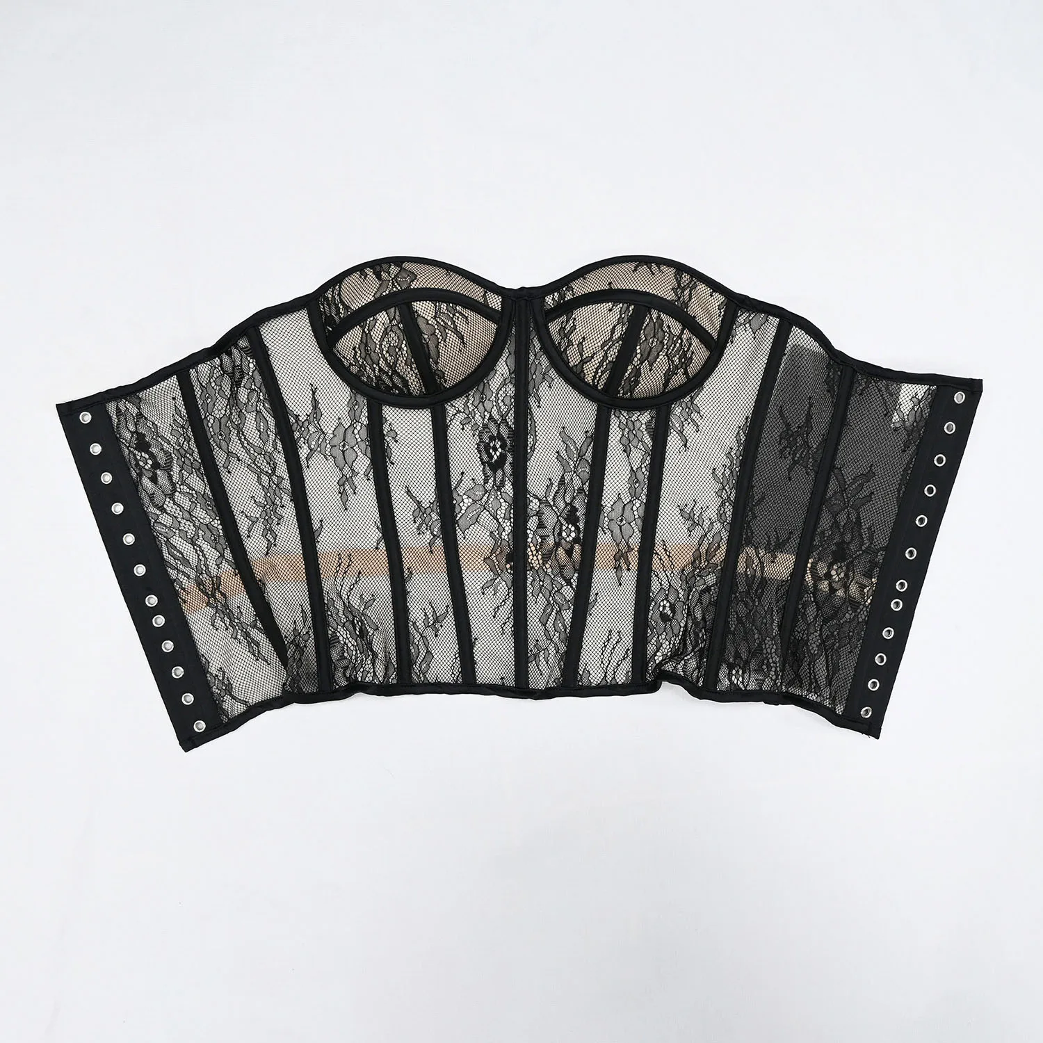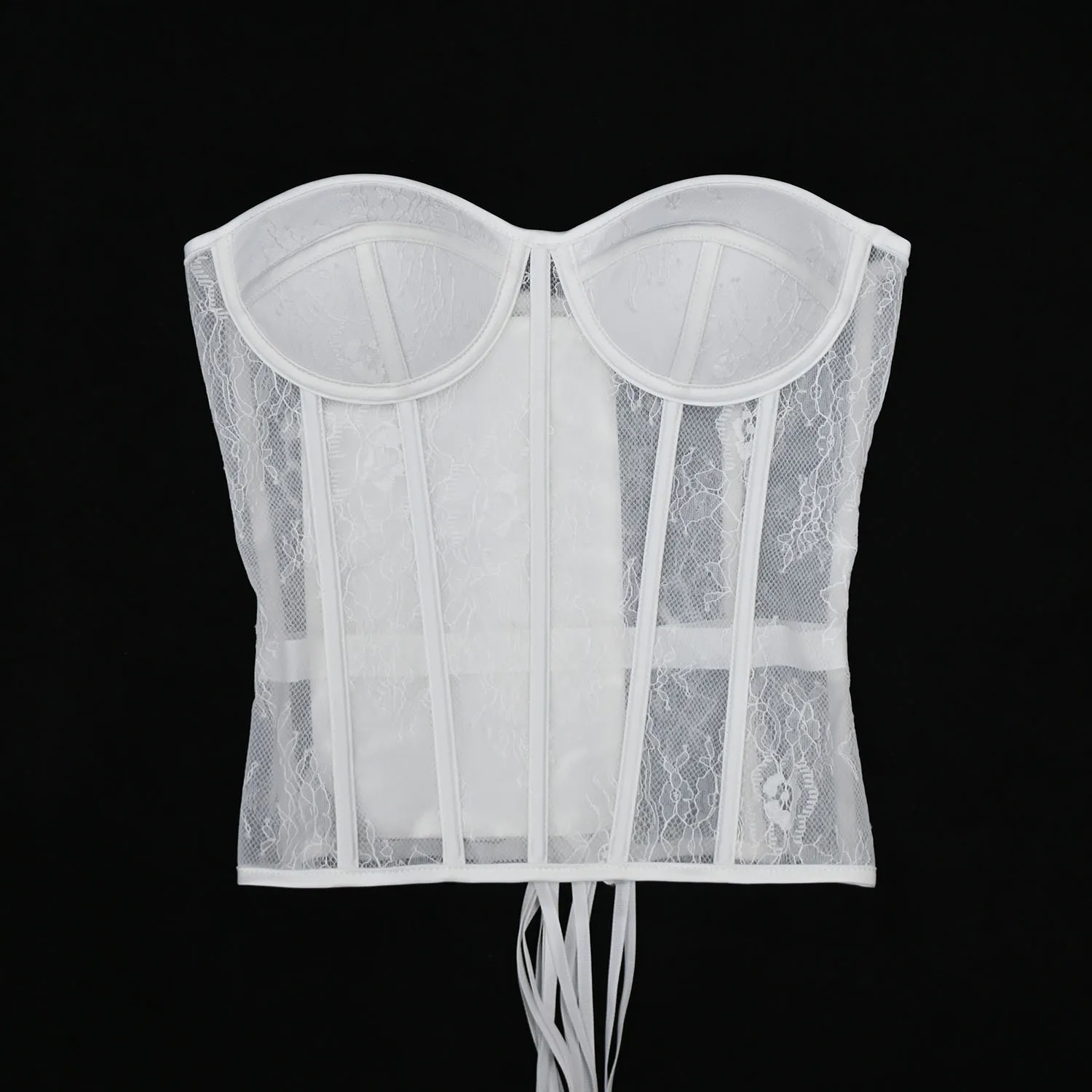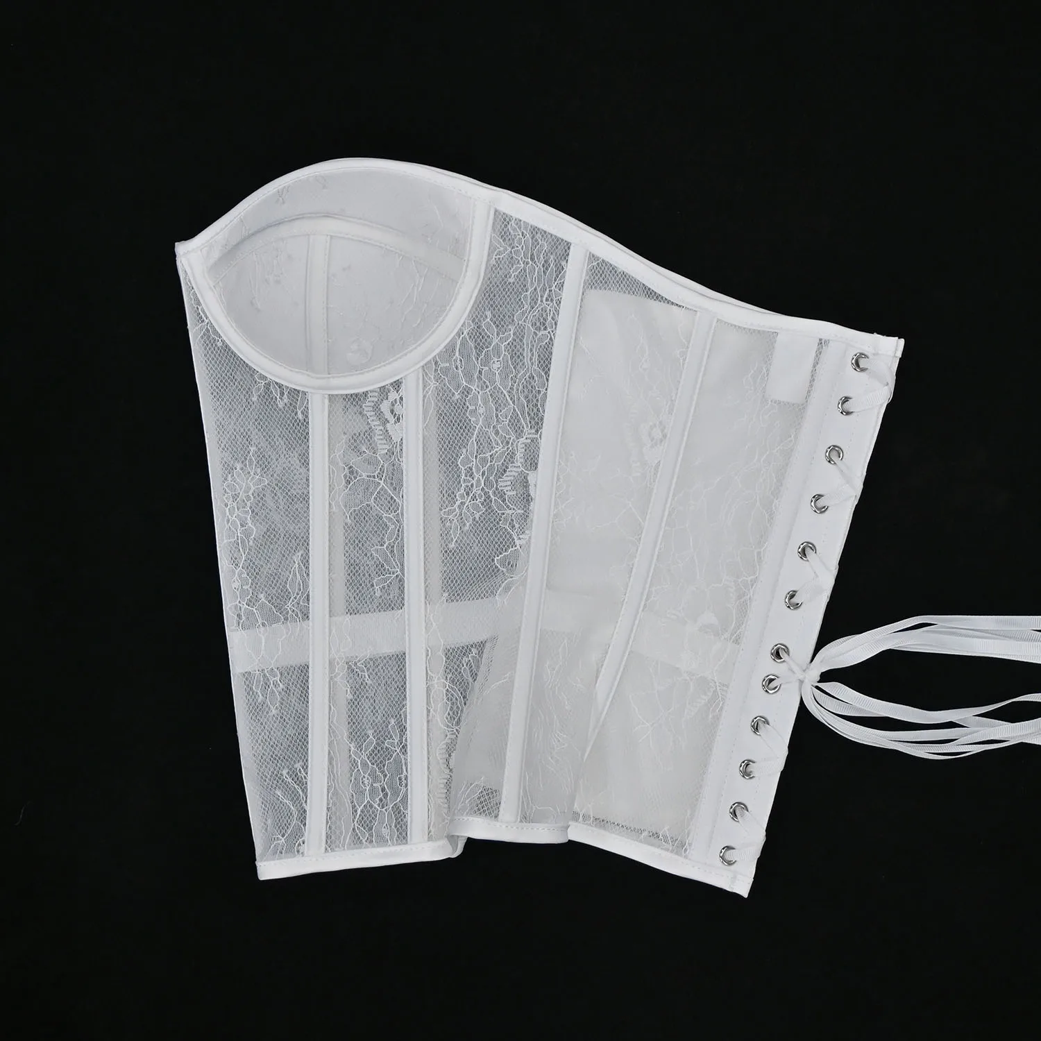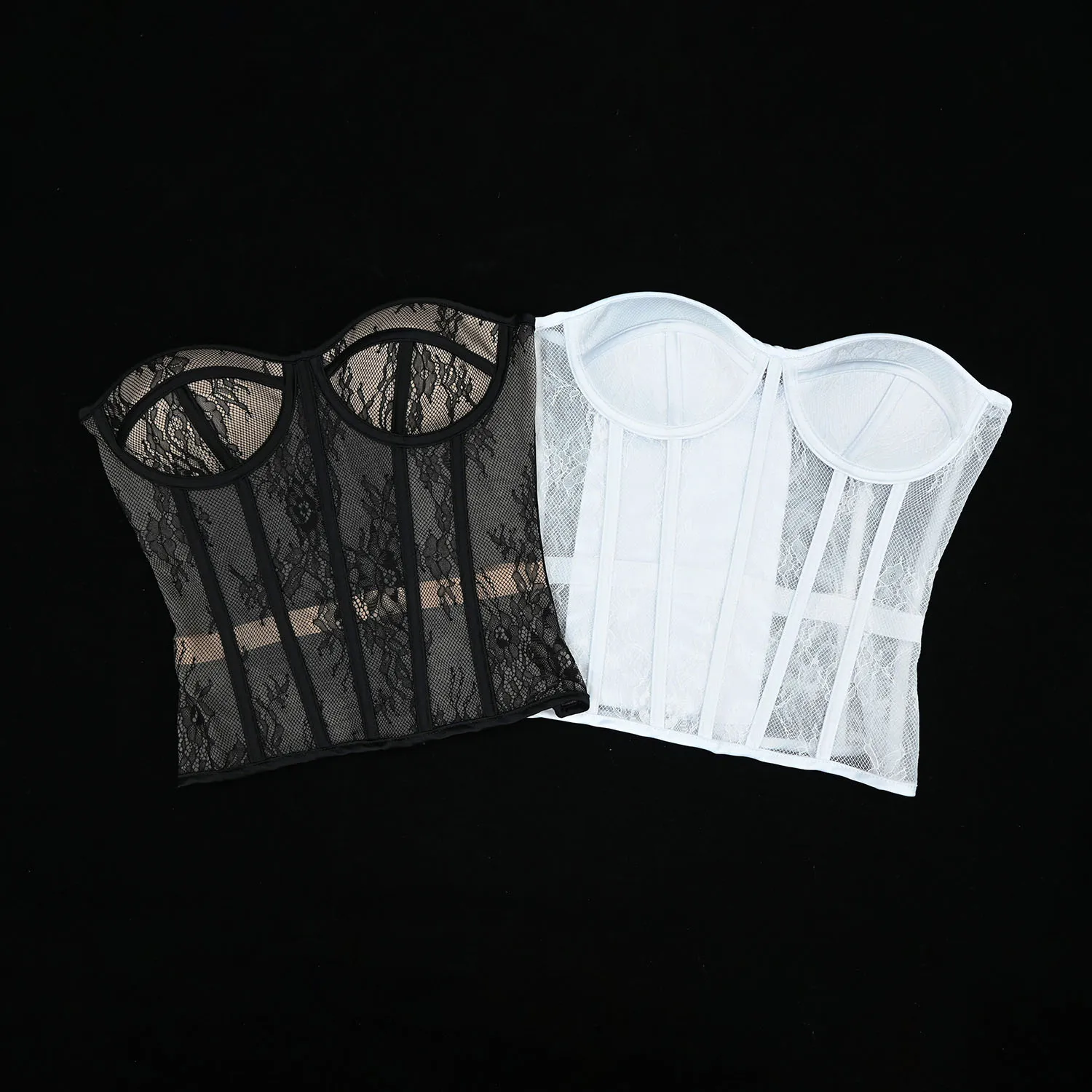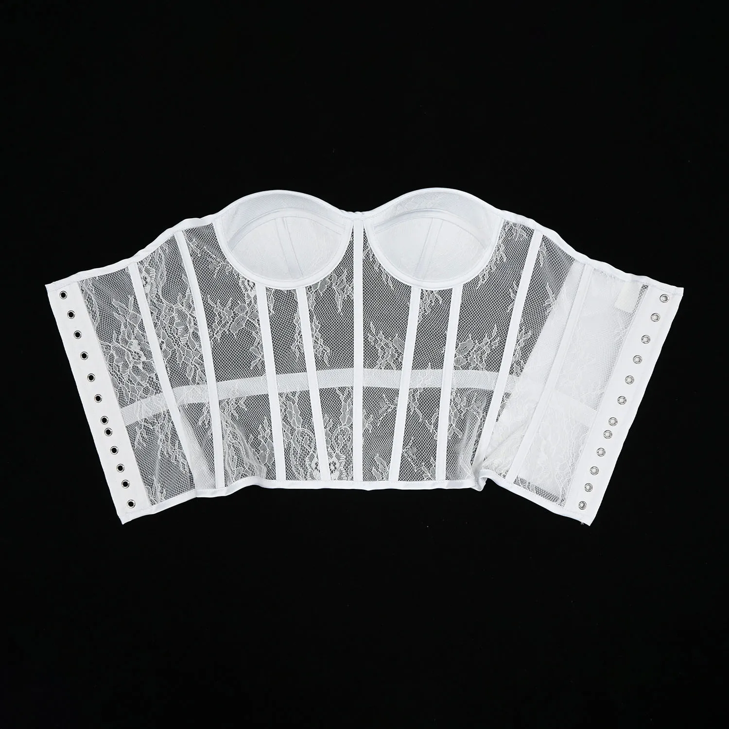 Steel Bone Korset Woman Hollow Out Strapless Lace Bra Bustier Top Mesh Women Lingerie Black White Biege Corset