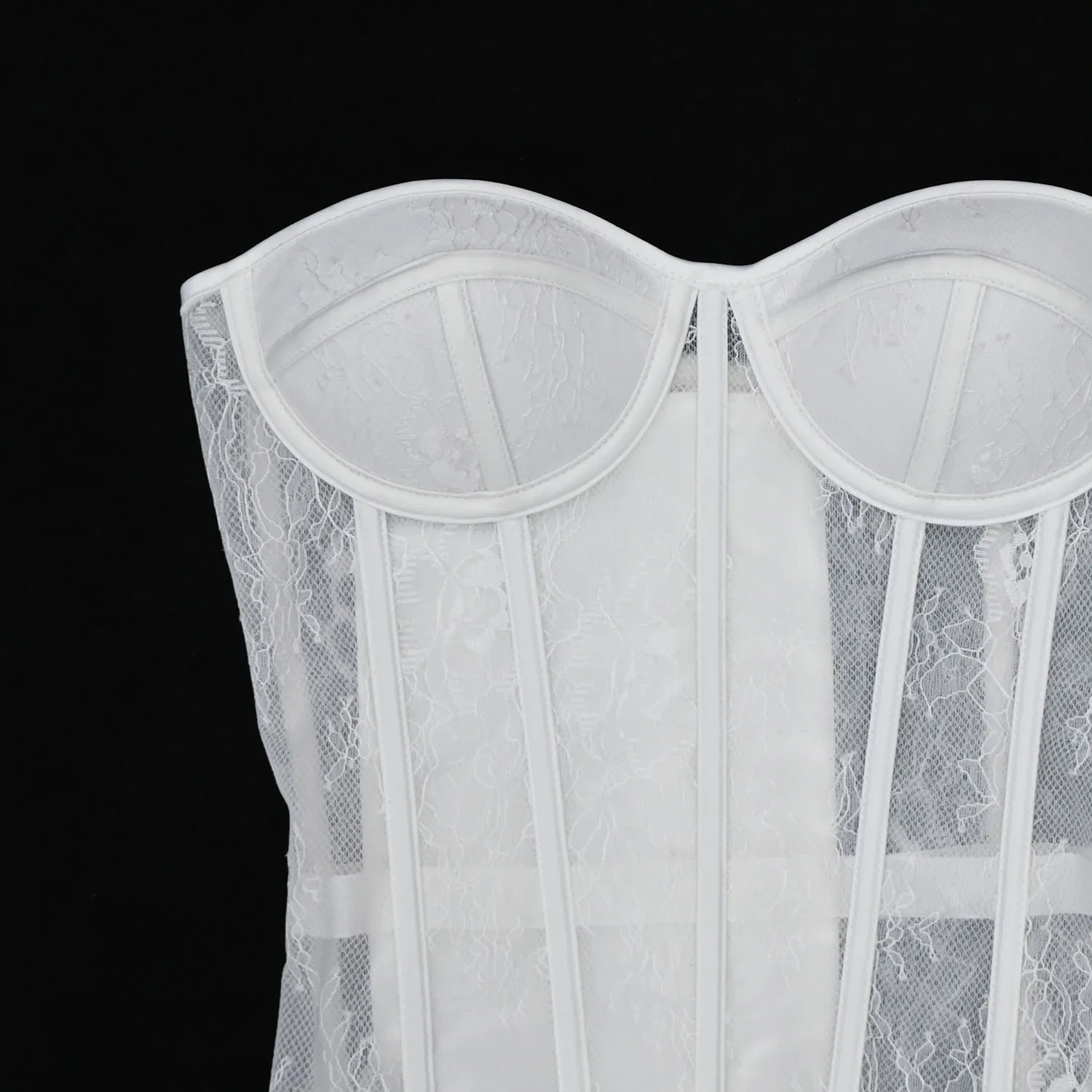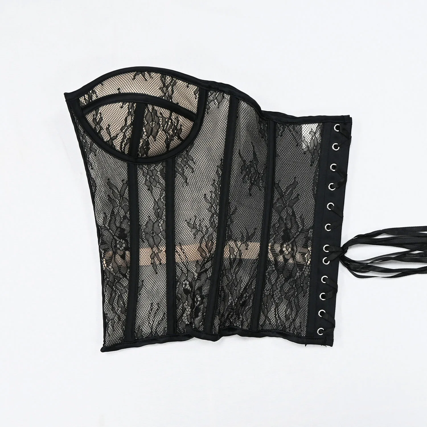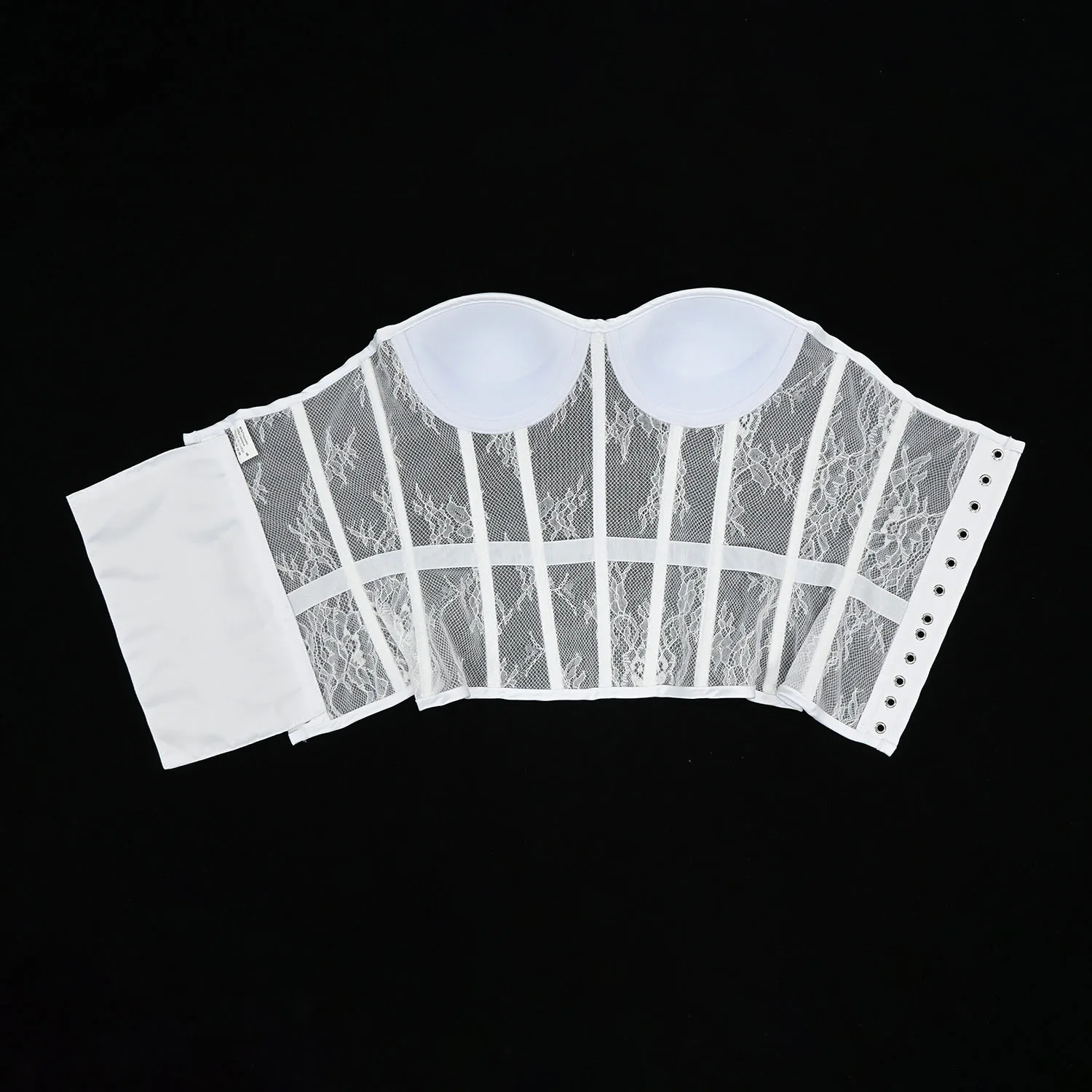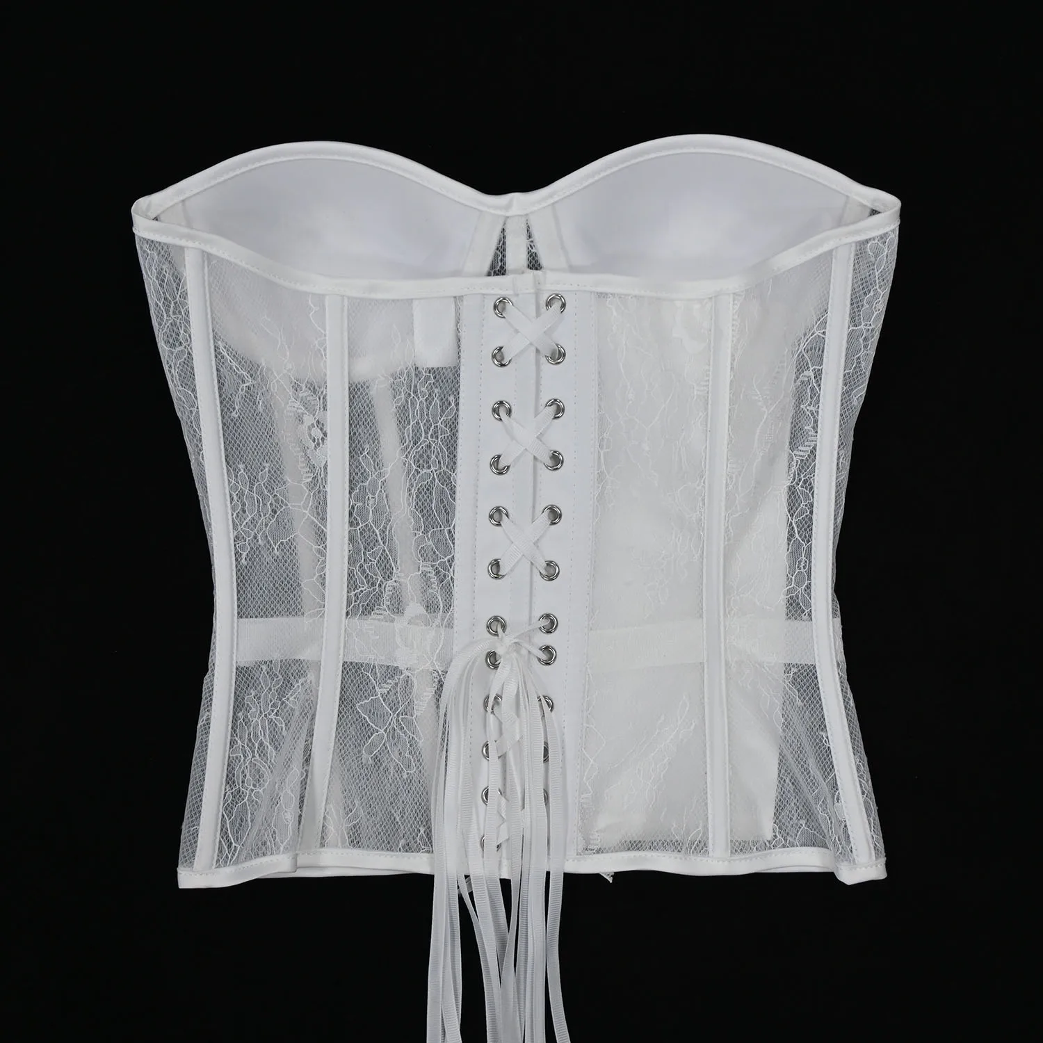 Steel Bone Korset Woman Hollow Out Strapless Lace Bra Bustier Top Mesh Women Lingerie Black White Biege Corset