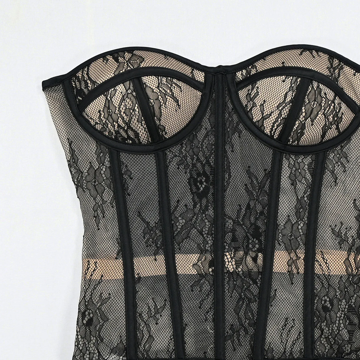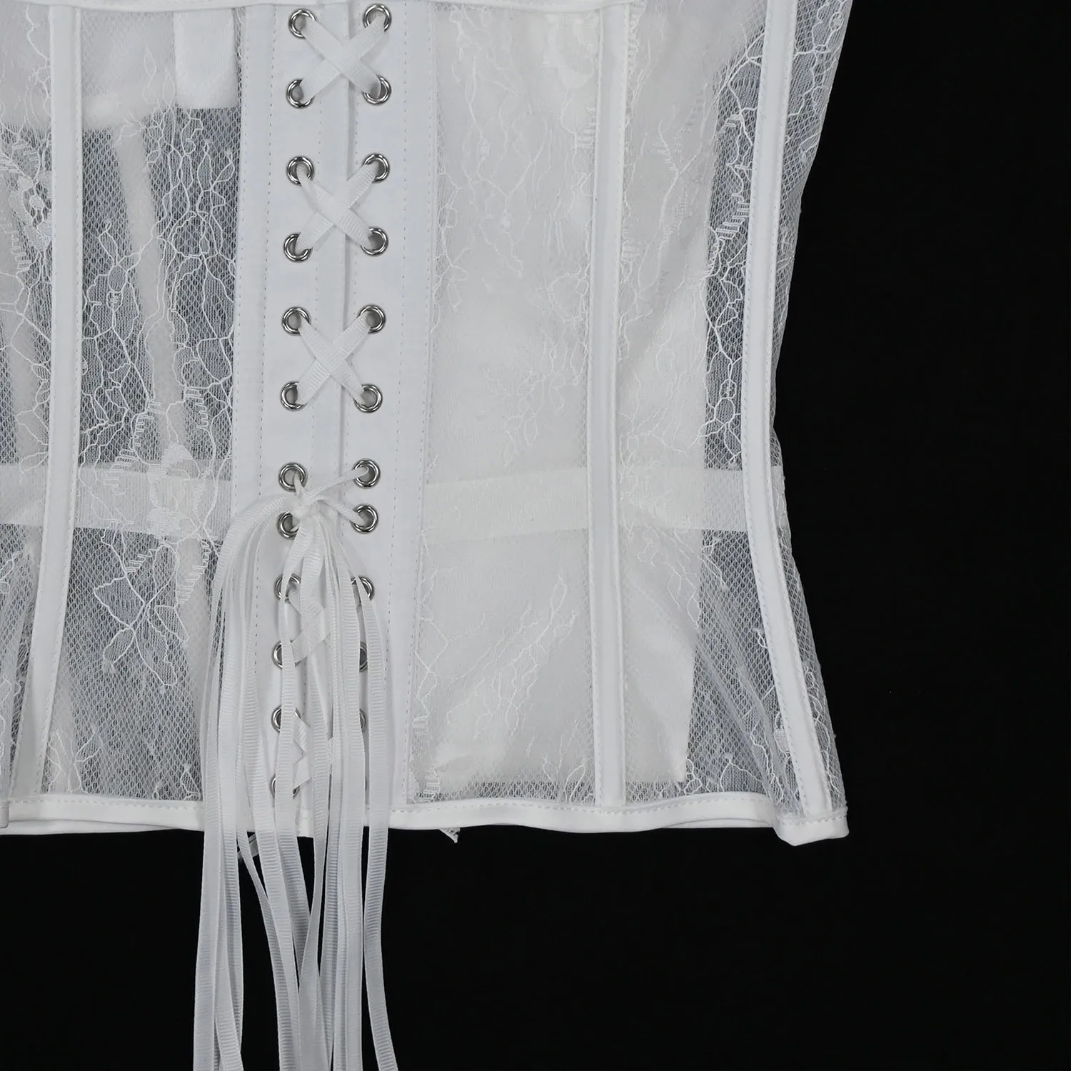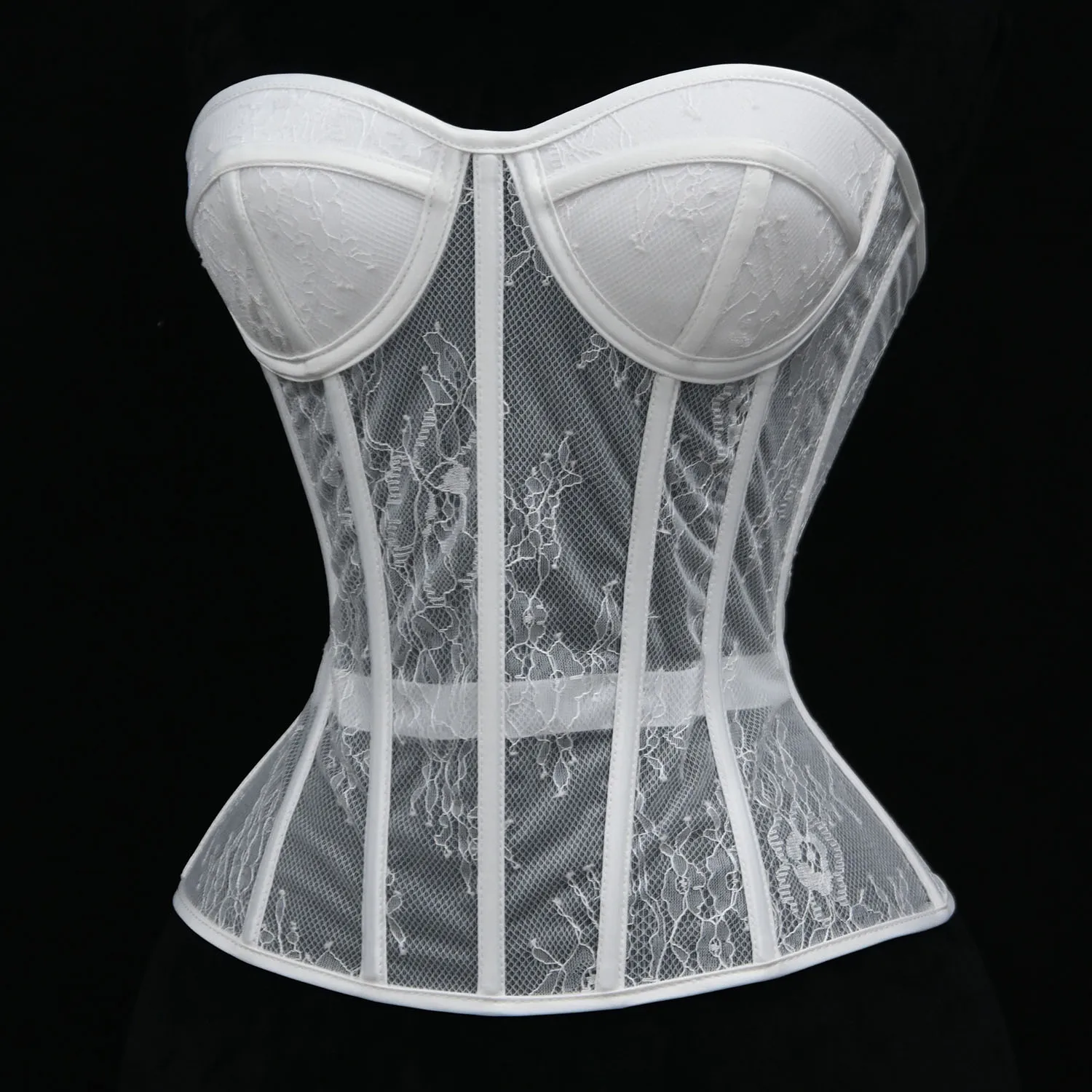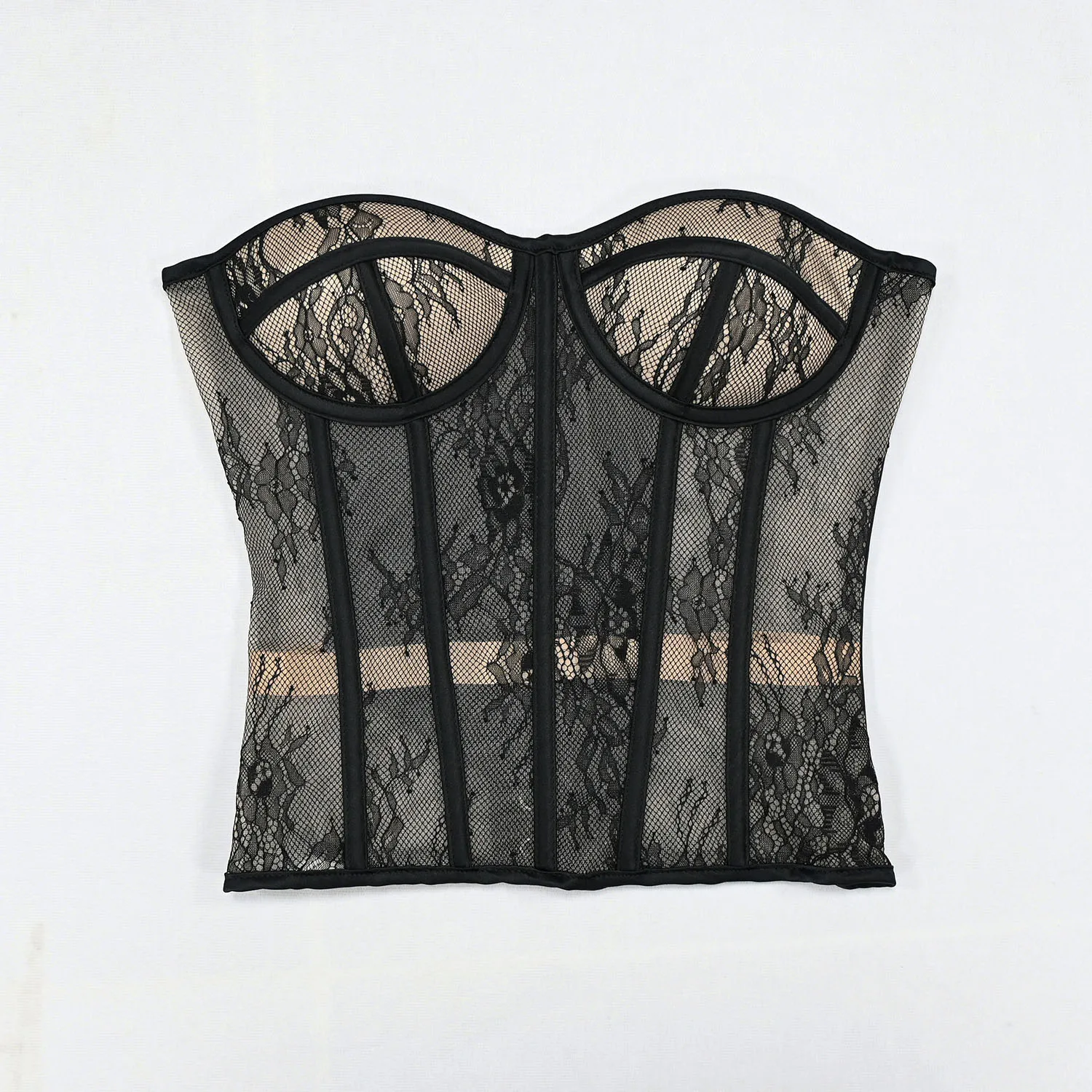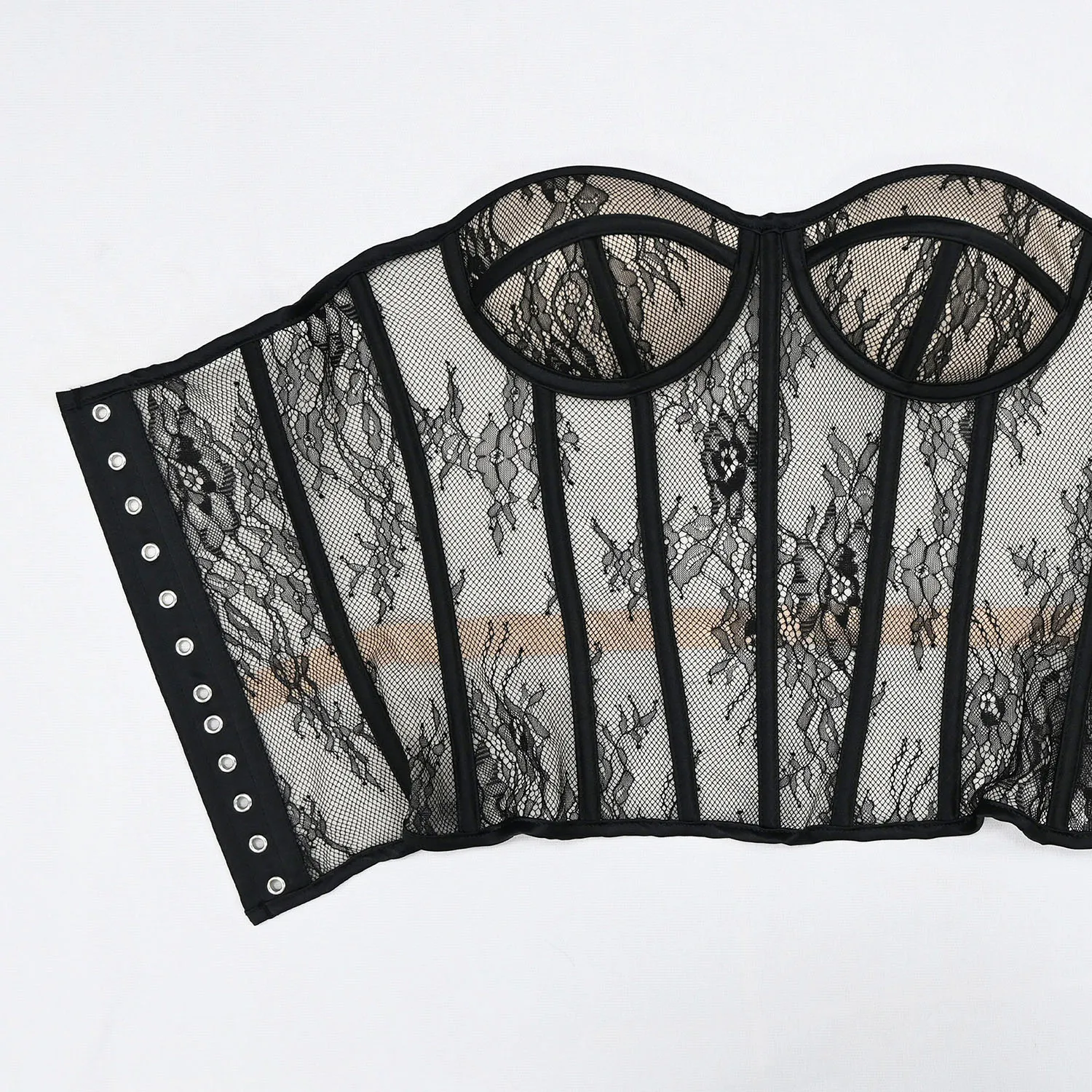 Steel Bone Korset Woman Hollow Out Strapless Lace Bra Bustier Top Mesh Women Lingerie Black White Biege Corset